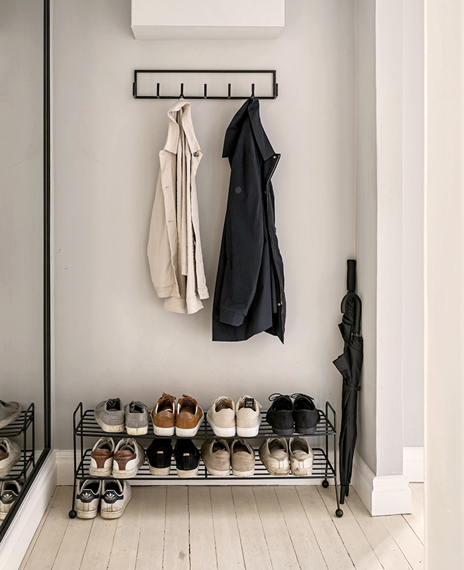 Låt bara säsongens skor och jackor hänga framme, medan resten stuvas undan. Mindre rörigt och lättare att hitta det du faktiskt behöver.