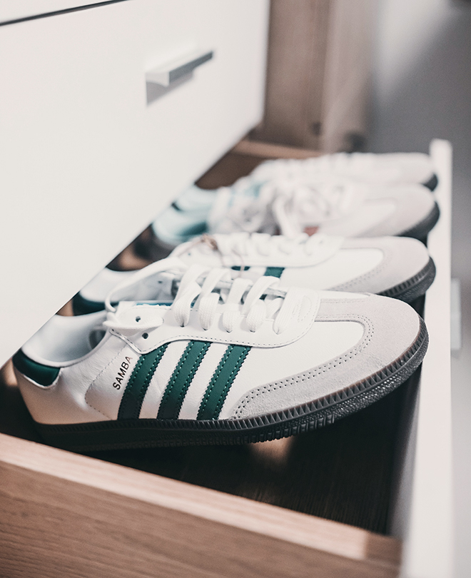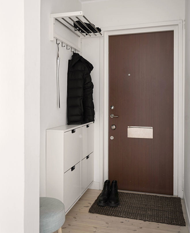Om du har plats, investera i en bänk med förvaring under – perfekt för skor och samtidigt en sittplats när du tar på dig skorna.