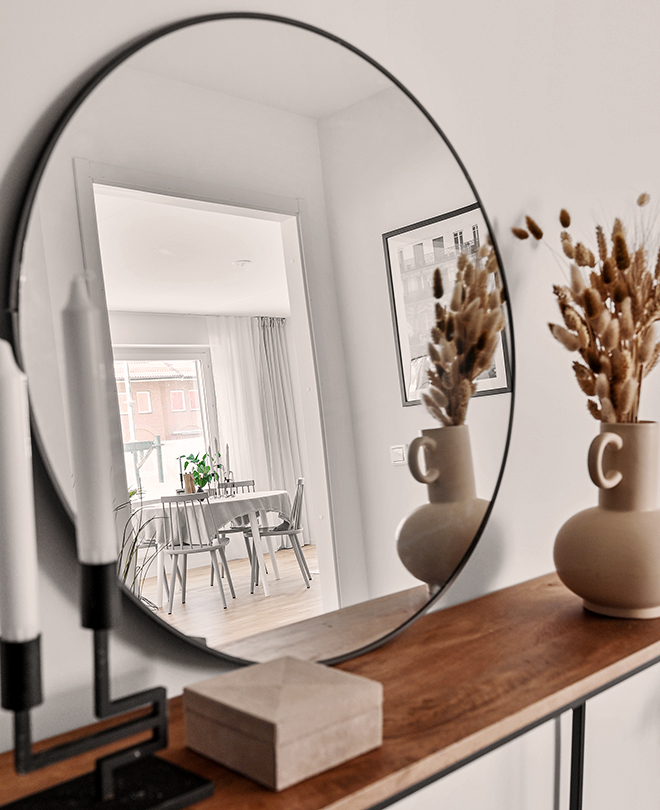 En spegel är ett måste i hallen. En stor spegel ger rymd, medan en rund spegel mjukar upp intrycket. Häng spegeln så att du enkelt kan ta en sista titt innan du går ut. Kombinera gärna med en liten hylla under för nycklar och accessoarer.