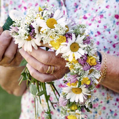 - När du har gått hela varvet runt och din midsommarkrans är fyllig och fin kan du pilla in de sista stjälkarna så att de inte sticker ut.