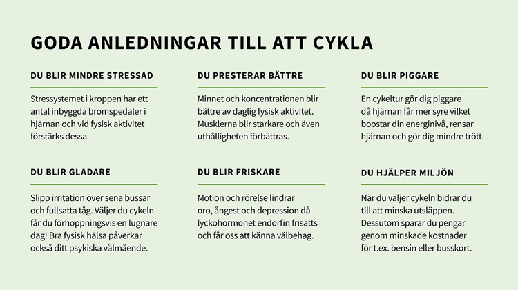 Att promenera, cykla eller åka kollektivt är att resa hållbart. Behöver du ändå ta bilen, fundera på mer klimatsmarta alternativ som samåkning, bilpool eller miljöbil. I våra bostäder vill vi göra det enkelt för dig att välja cykeln, därför bygger vi alltid rejäla cykelrum och skapar ofta utrymmen för cykelverkstad.