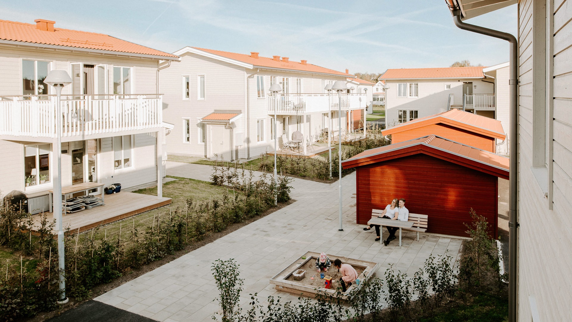 – Vi trivs verkligen och har inte ångrat vårt beslut, säger Camilla. Vi har till och med rekommenderat våra vänner att flytta hit. Tidigt i byggprocessen kunde vi välja vilken lägenhet vi ville ha och påverka inredningen. Vi köpte en trea på andra våningen med en stor balkong med kvällssol och ingen insyn. Där har vi tillbringat mycket tid i sommar och balkongen känns nästan som ett extra rum. Lägenheten har öppen planlösning, stora fönster och ett härligt ljusinsläpp. På framsidan har vi en liten uteplats med morgonsol, säger Camilla.