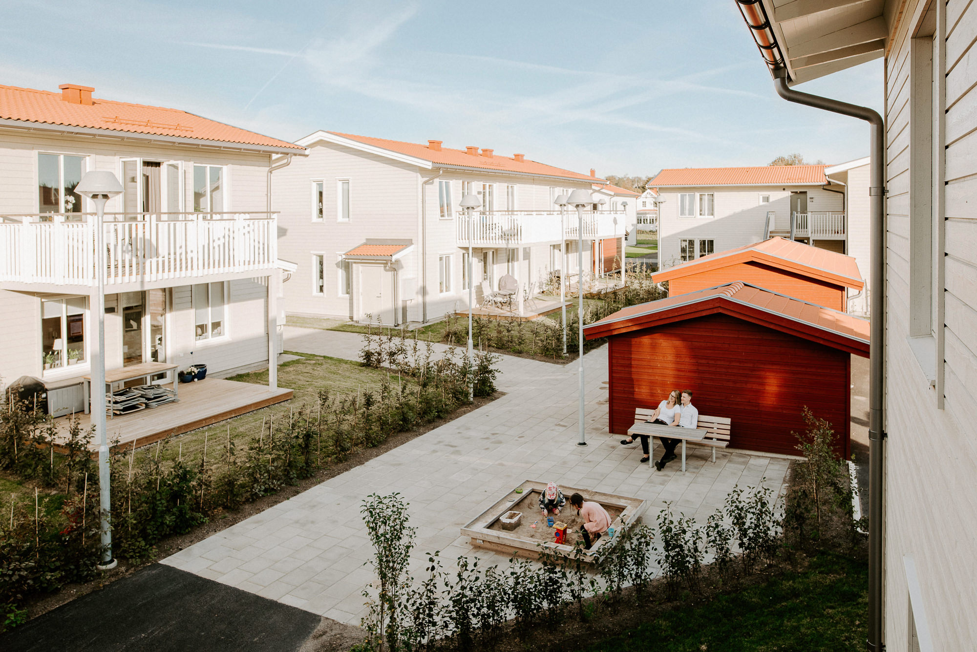 – Vi trivs verkligen och har inte ångrat vårt beslut, säger Camilla. Vi har till och med rekommenderat våra vänner att flytta hit. Tidigt i byggprocessen kunde vi välja vilken lägenhet vi ville ha och påverka inredningen. Vi köpte en trea på andra våningen med en stor balkong med kvällssol och ingen insyn. Där har vi tillbringat mycket tid i sommar och balkongen känns nästan som ett extra rum. Lägenheten har öppen planlösning, stora fönster och ett härligt ljusinsläpp. På framsidan har vi en liten uteplats med morgonsol, säger Camilla.