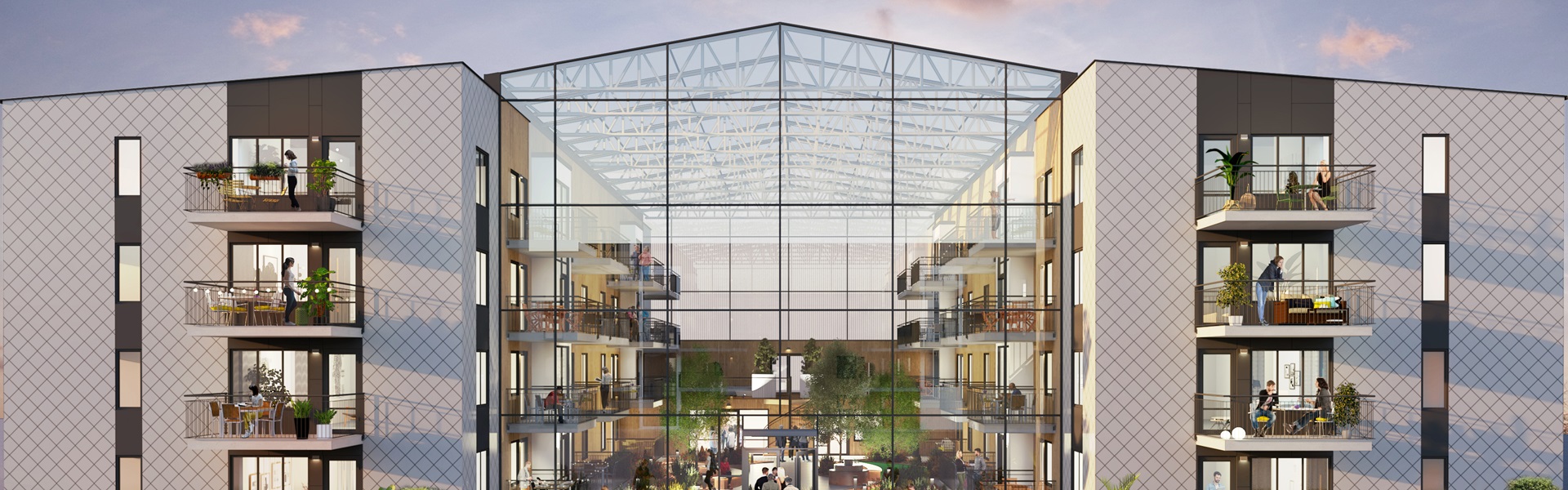 Här kommer nämligen Trollhättans största inglasade trädgård att ligga – 500m2 stor och fyra våningar hög, designad av landskapsarkitekten John Tizzard. Trädgården kommer att länka samman de båda huskropparna och ge boende tillgång till en grön skön utemiljö året om.