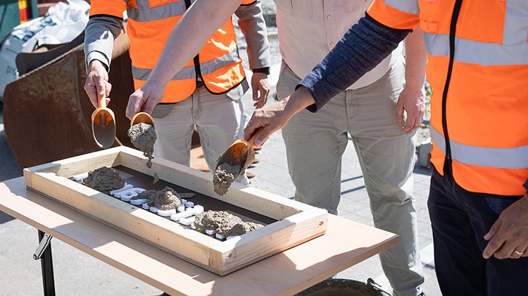 För att inviga byggnationen av bostäderna i Mittfältaren gjöt besökarna tillsammans en skylt med bostadsprojektets namn som kommer att pryda den blivande kvartersgården.
