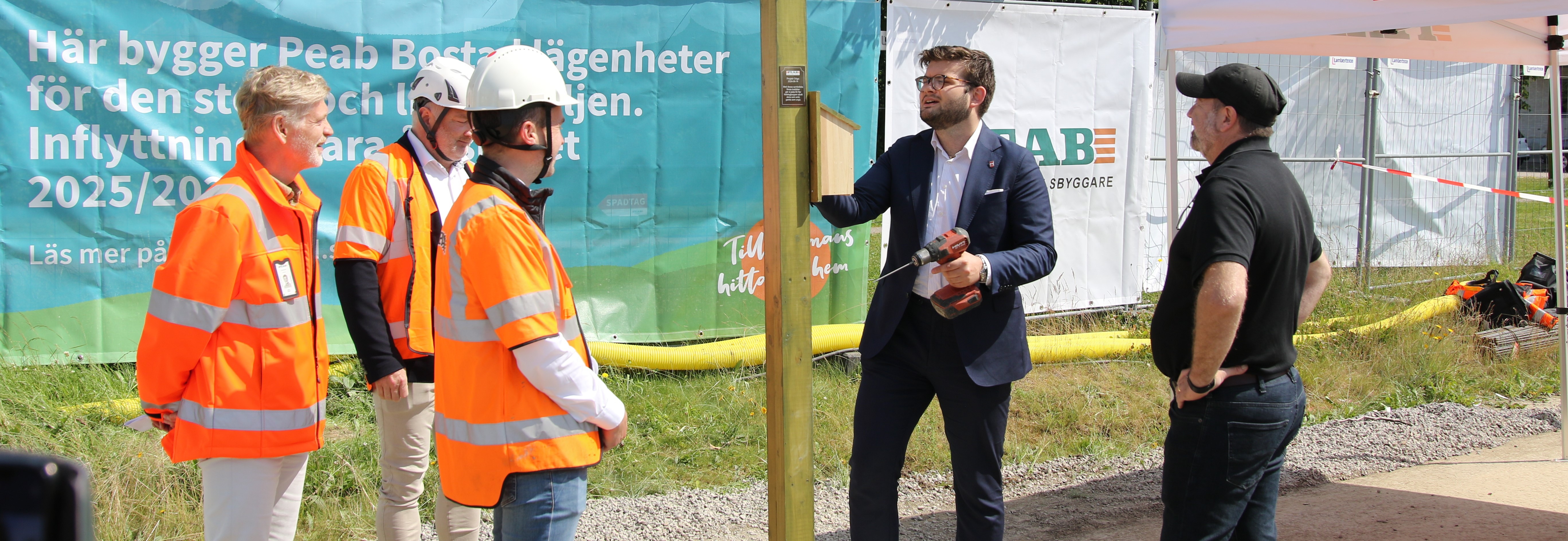 Drygt 30 personer hade samlats på plats tillsammans med representanter från Peab, stadsbyggnadsnämnden ordförande Alexander Svensson och Peabs första kunder för att utföra en speciell ceremoni. För att välkomna de första boendena till kvarteret och främja ett liv för fåglar och insekter skruvade man upp fågelholkar, insekthotell och fyllde ett fågelbad med vatten. Allt planeras att stå kvar på gården när bostadskvarteret står redo för inflyttning under hösten/vintern 2025.