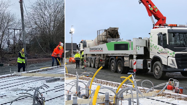 Stefana Hoti, vice kommunstyrelseordförande (MP) fick äran att fylla den första husgrunden med rykande färsk Eco-betong.