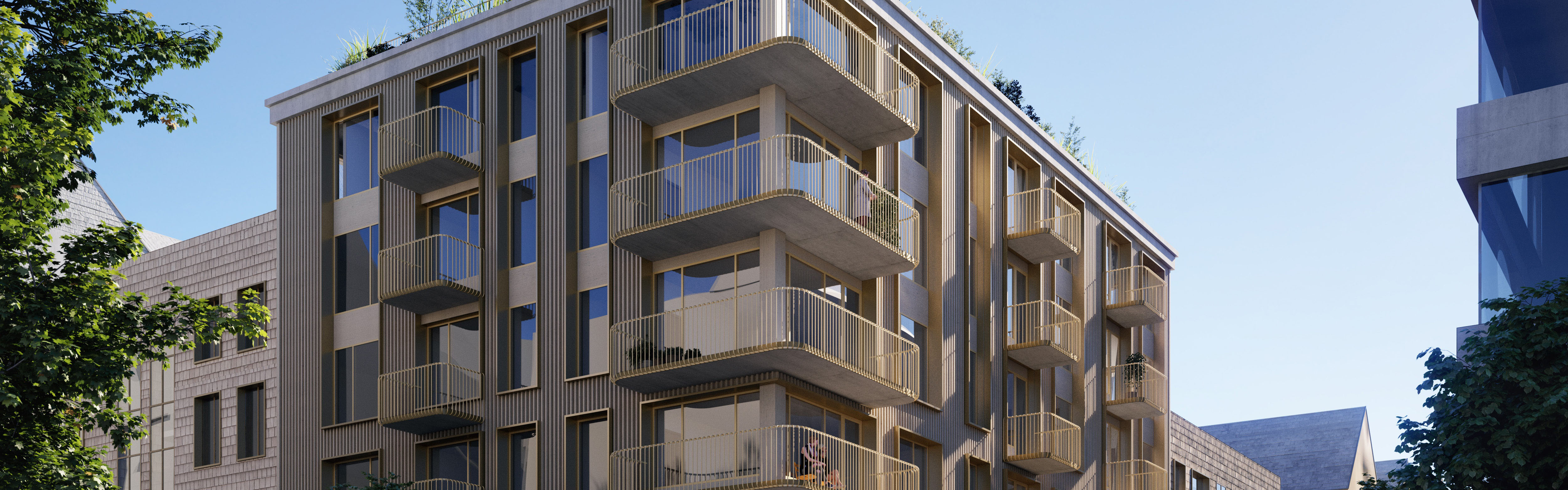 Den arkitektoniska idén är en modern tolkning på det stadsmässiga funkishuset med balkong över hörn som ger en stadsmässig karaktär åt platsen, nu uppfört i träteknik med en fasad av träribbor som förstärker områdets identitet.