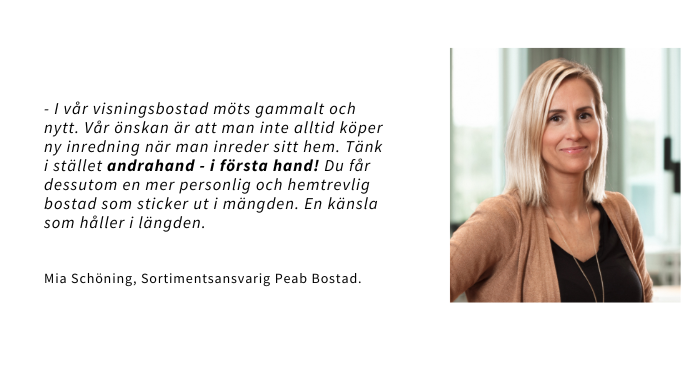 Intresset för återbruk har exploderat de senaste åren. Peab Bostad vill bidra samt inspirera till en smartare konsumtion och hållbar livsstil. När den senaste visningsbostaden i Varvsstaden skulle inredas påbörjades ett samarbete med Erikshjälpen Second Hand. Med ledorden hållbarhet, personligt och originellt vill man uppmuntra fler till återbruk. Det går hand i hand med Varvsstadens vision om att förvalta arvet från varvet. Gammalt möter nytt och skapar en unik stil samtidigt som man värnar om miljön.
