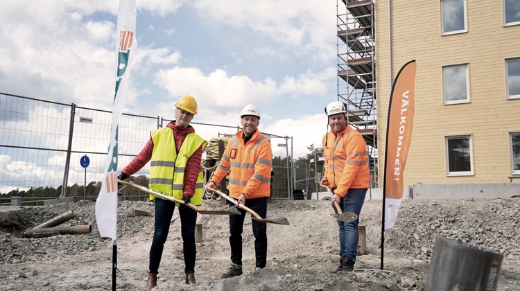 De som är med på spadtagsbilden är: Joakim Otternäs, projektledare Peab Bostad, Solweig Gard, ordförande för kommunstyrelsen i Hammarö och Johan Fredriksson, Projektchef Peab Sverige